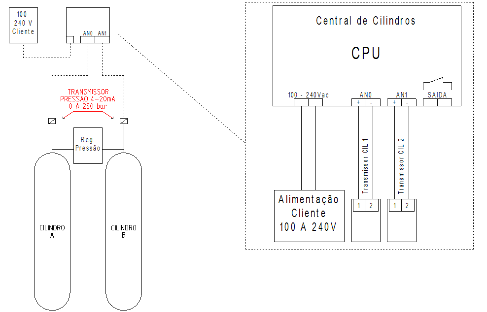 Equipamento microprocessado desenvolvido para o monitoramento de pressão de vasos pressurizados entre 0 a 400 Bar. Esse controle pode ser local, com indicação e configurações via IHM de 4 linhas por 20 caracteres, com o monitoramento de falta de produto, acionando uma sirene e exibindo uma mensagem na tela. E pode também ser via telemetria, através de um circuito interno via wireless e um qualquer modem externo para fornecer a internet. Configurações via IHM de SSID e Senha do wireless. Todos os valores de leitura e status ficará disponível em tempo real no portal do site, onde o usuário terá um login para acessar suas informações. Possui amplo espaço interno, facilitando as conexões elétricas, e possui saídas por prensa cabo, obtendo um IP65. Possui 2 pontos de entrada analógicos (4 a 20mA), e 1 saída discreta (digital) de alarme geral.